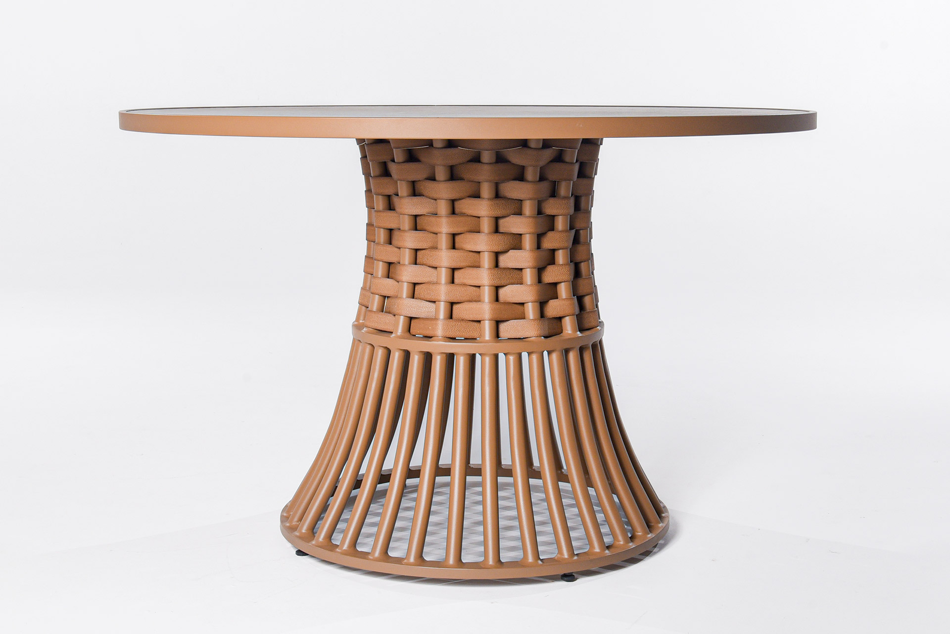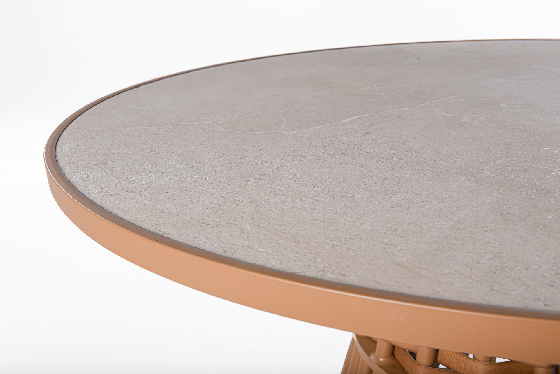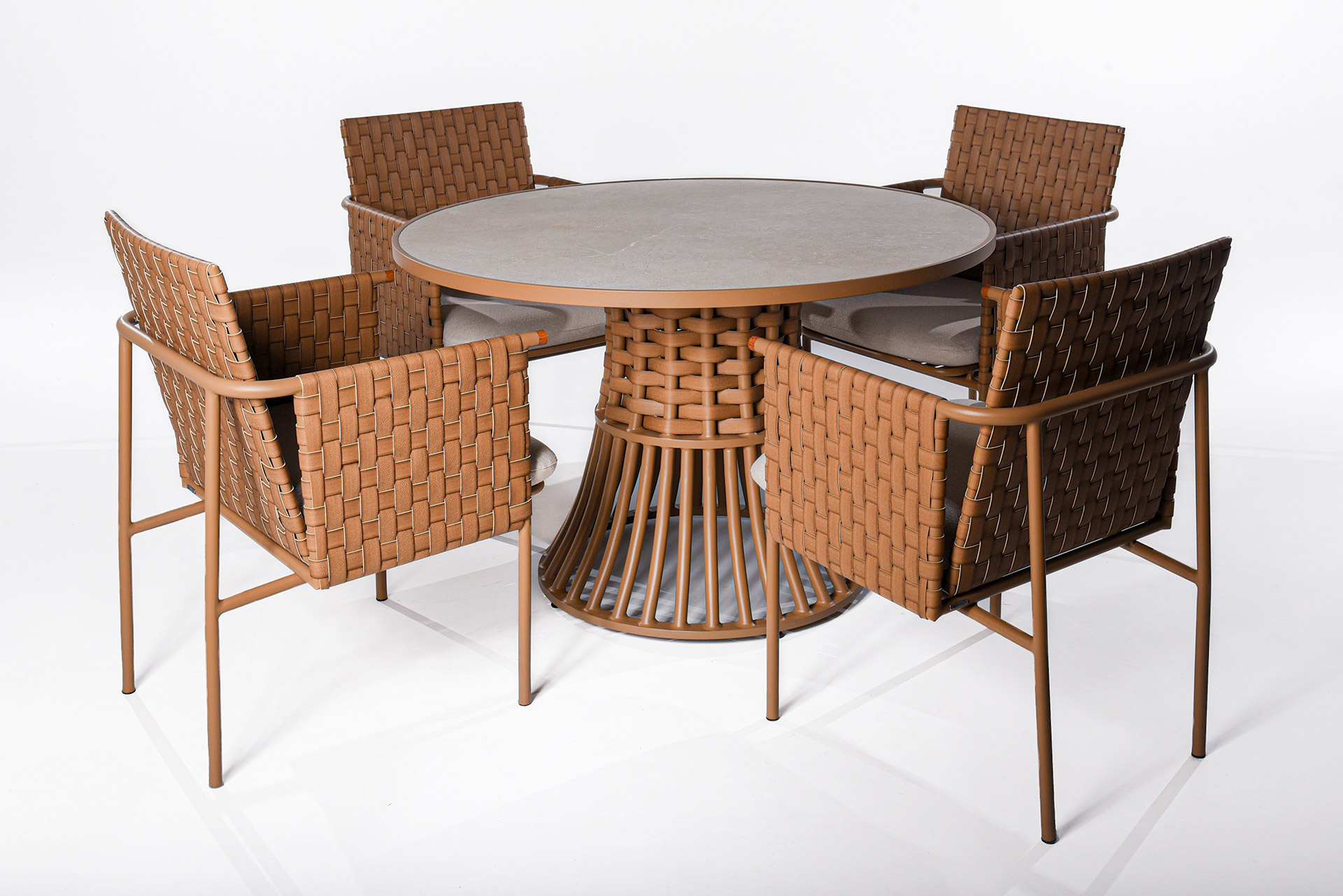A mesa Di Sole traduz a harmonia entre forma e matéria. Seu tampo em porcelanato traz elegância e resistência, enquanto os pés em alumínio com acabamento em couro sintético italiano revelam um trabalho artesanal que valoriza textura e leveza. O design contemporâneo e a composição equilibrada entre materiais nobres fazem da peça um ponto de destaque em ambientes externos e internos.