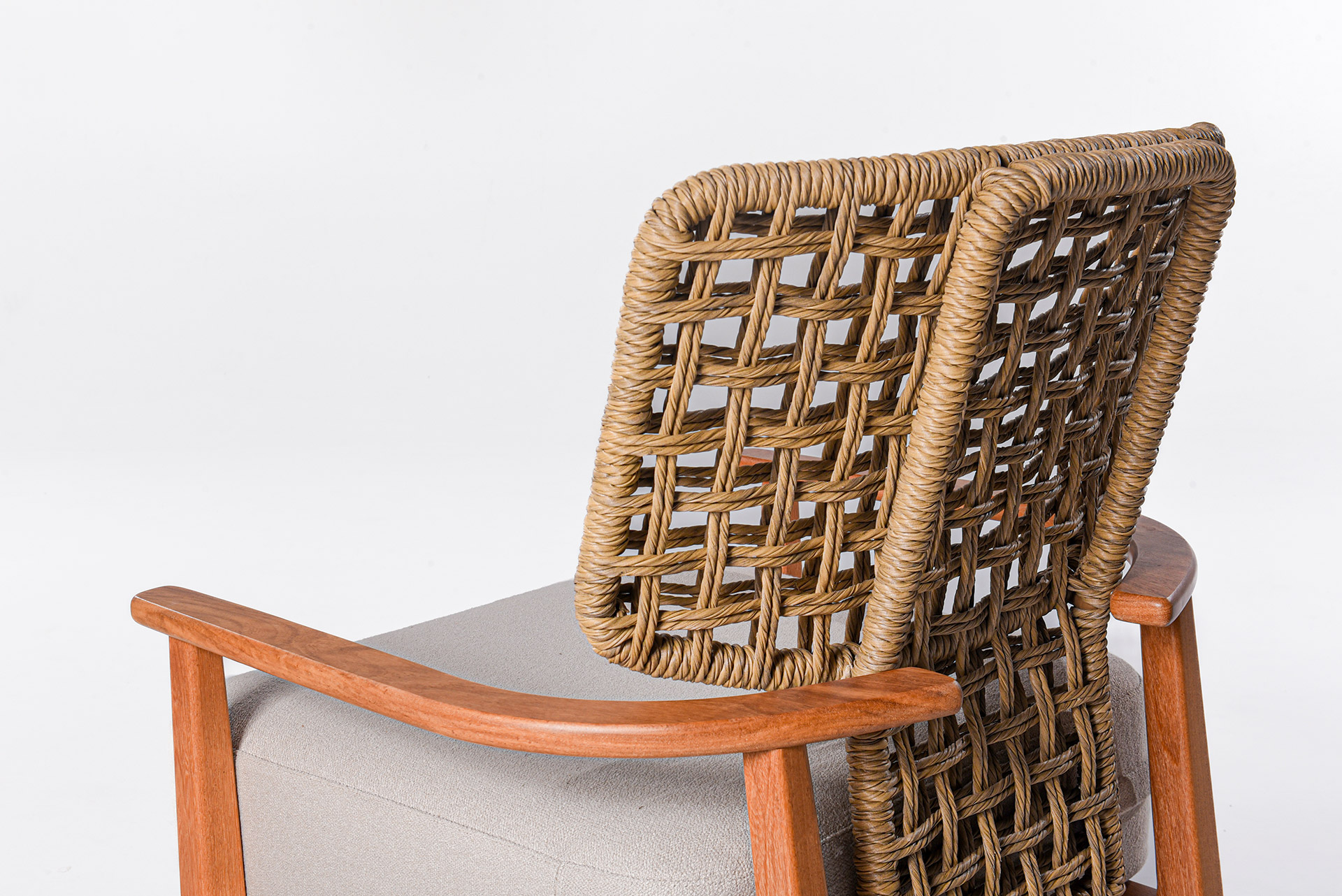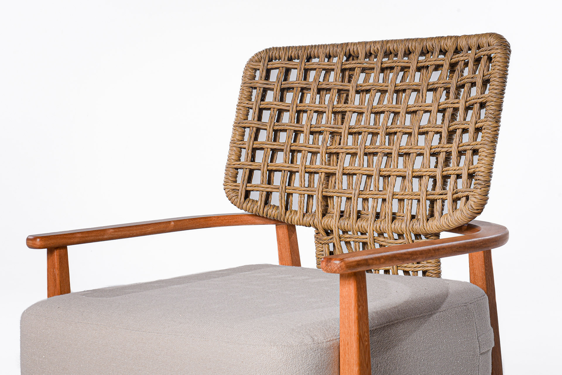 A poltrona Filo combina materiais nobres e formas delicadas para criar uma peça que transmite leveza e sofisticação. Sua estrutura em alumínio e madeira cumaru garante resistência e durabilidade, enquanto o revestimento em ráfia sintética adiciona textura e um toque artesanal, evocando a beleza dos elementos naturais.