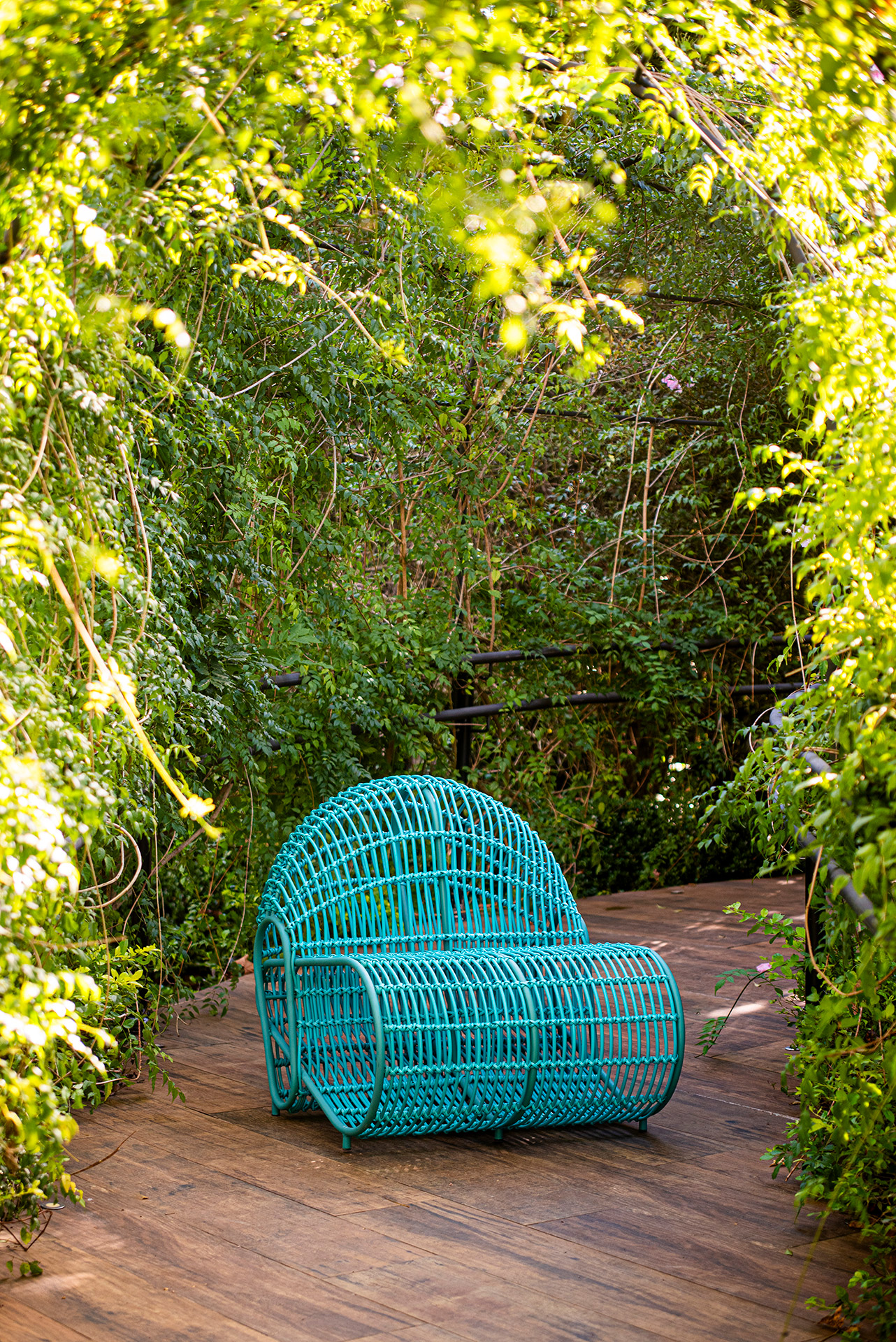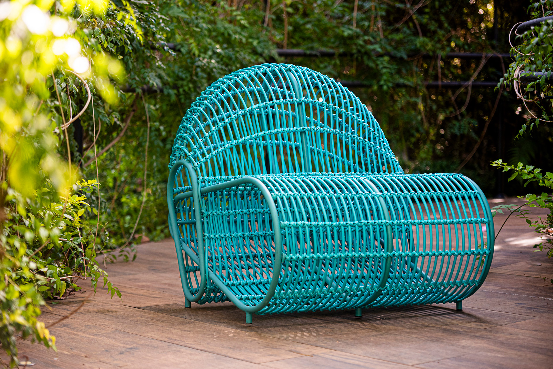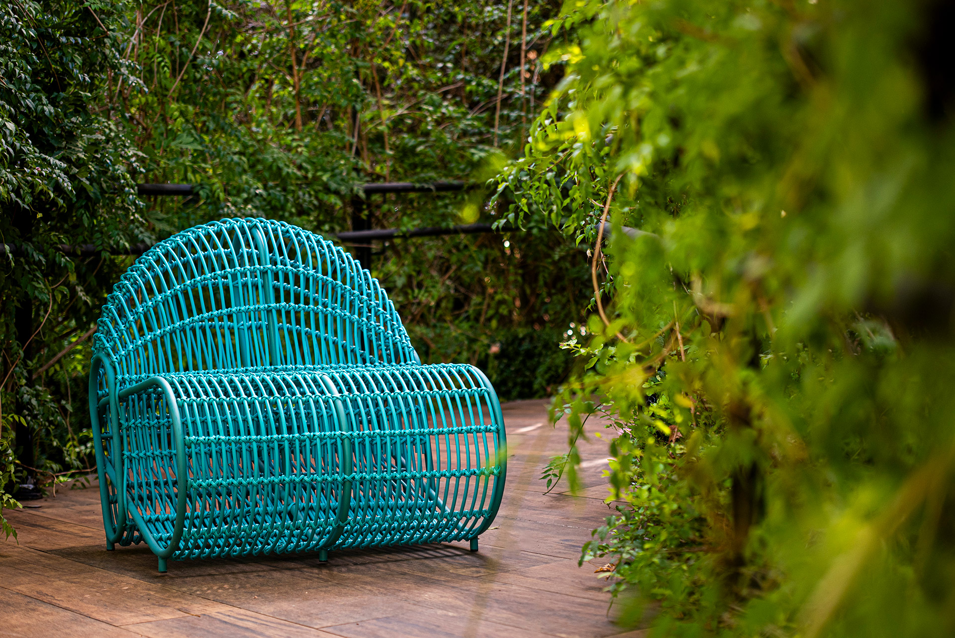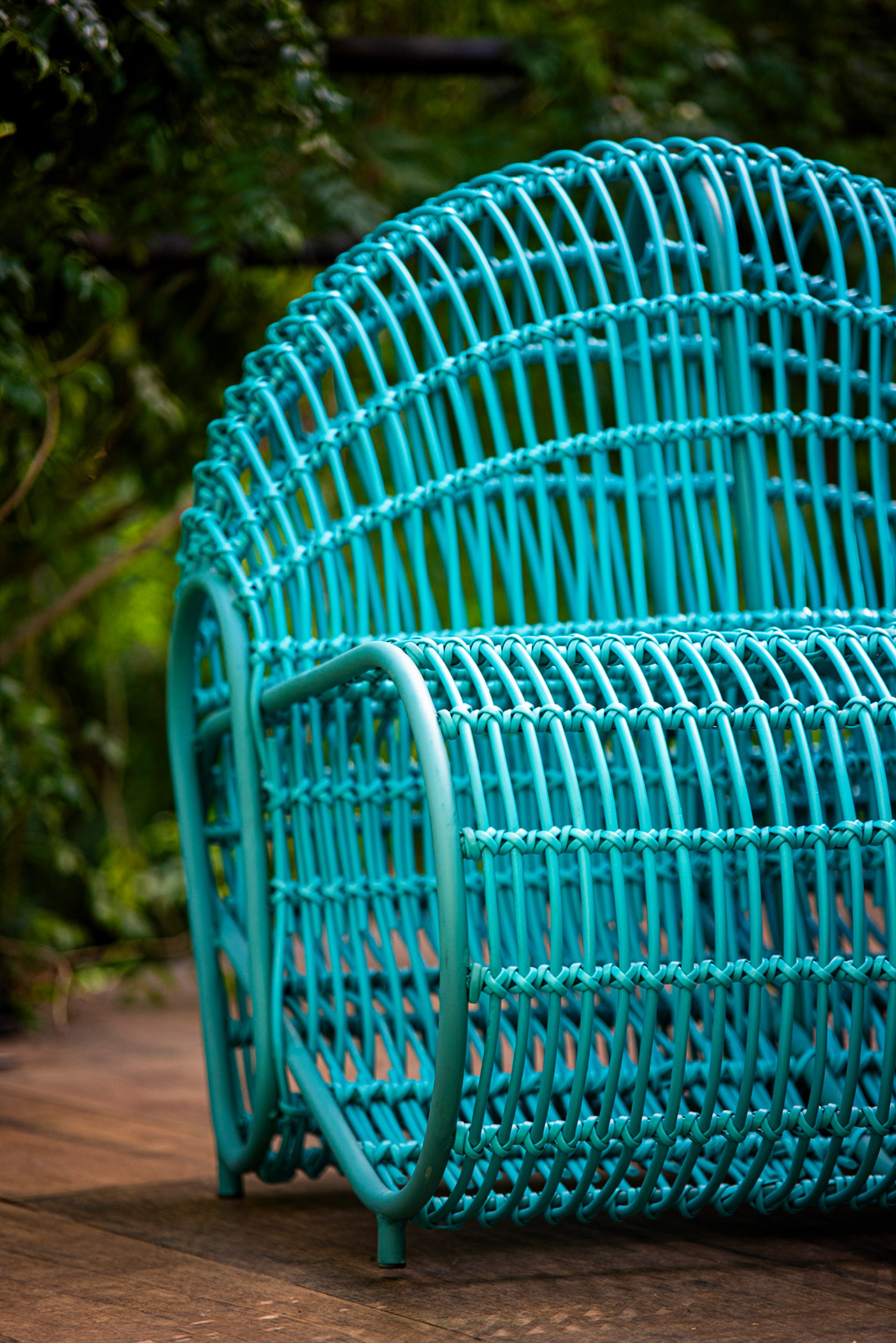 A Coleção Flutua é resultado de uma abordagem inovadora que utiliza a distorção criada pela água em um recipiente de vidro para explorar novas possibilidades de formatos. Posicionando os desenhos de maneira a aproveitar esse efeito óptico, a coleção apresenta peças com um desenho arredondado, alongado e assimétrico. Composta por sofá, poltrona e mesa de centro, toda a coleção é feita de vime, em uma estrutura que se intercala e se entrelaça, criando uma estética única e contemporânea.