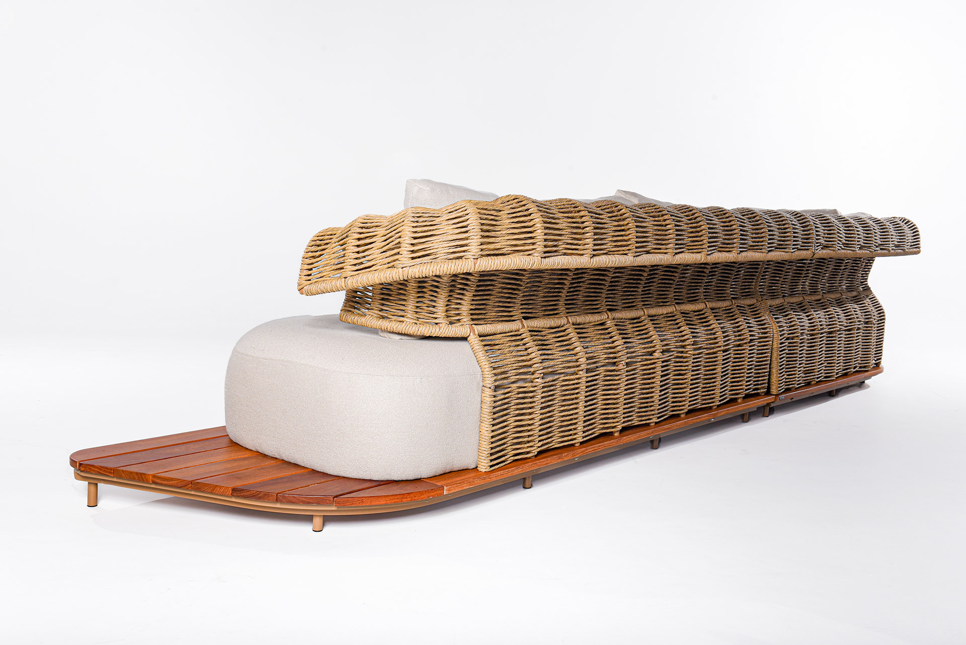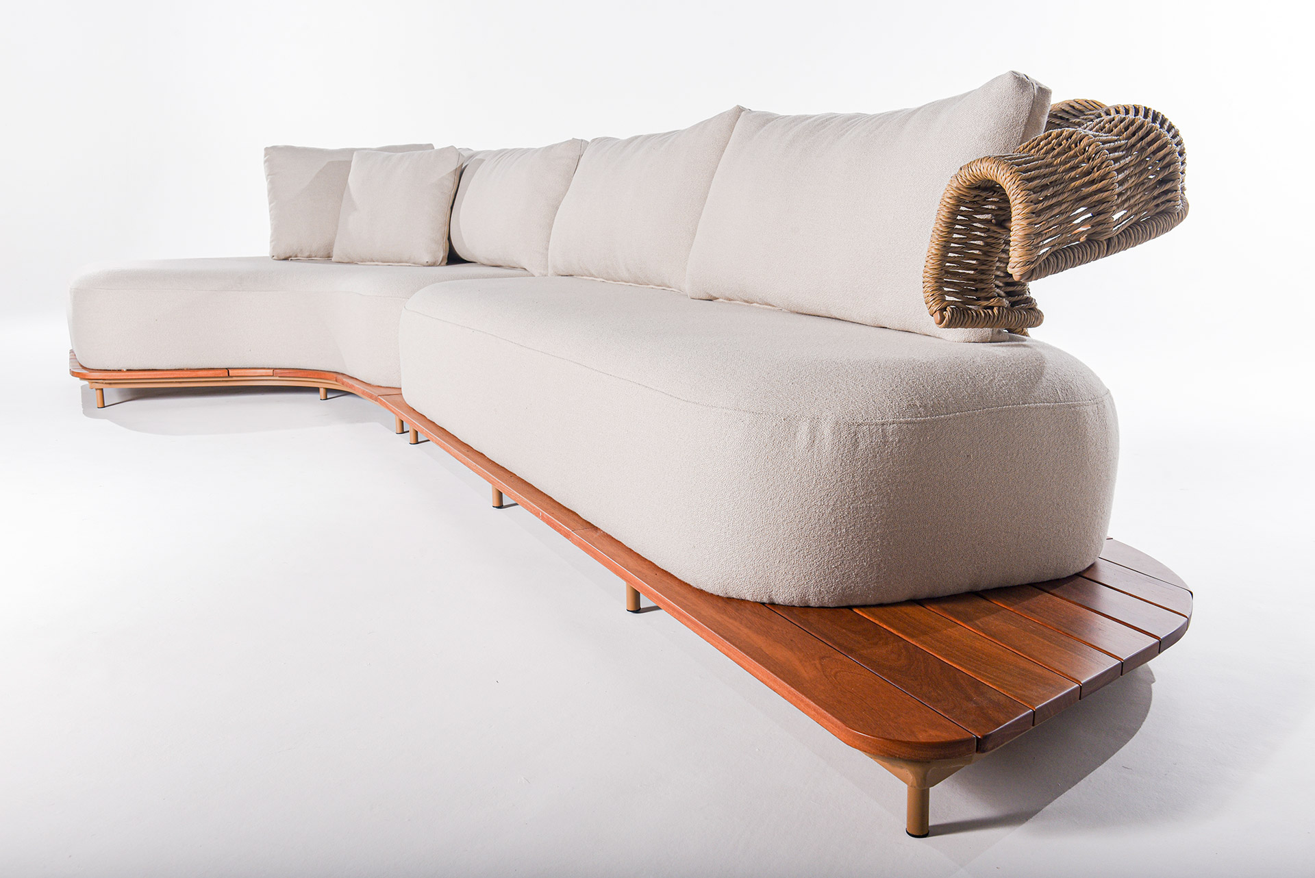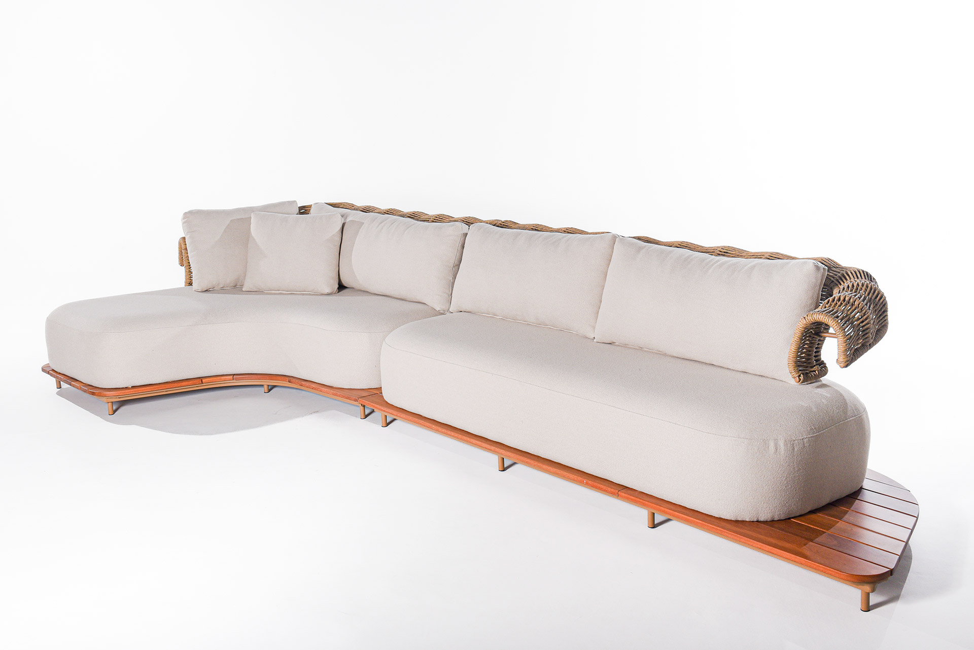 O sofá Limoncello traduz a harmonia entre leveza, fluidez e sofisticação. Inspirado no movimento orgânico das ondas, seu desenho apresenta linhas envolventes e braços com trama delicada em corda náutica, que criam uma estética marcante e atemporal.