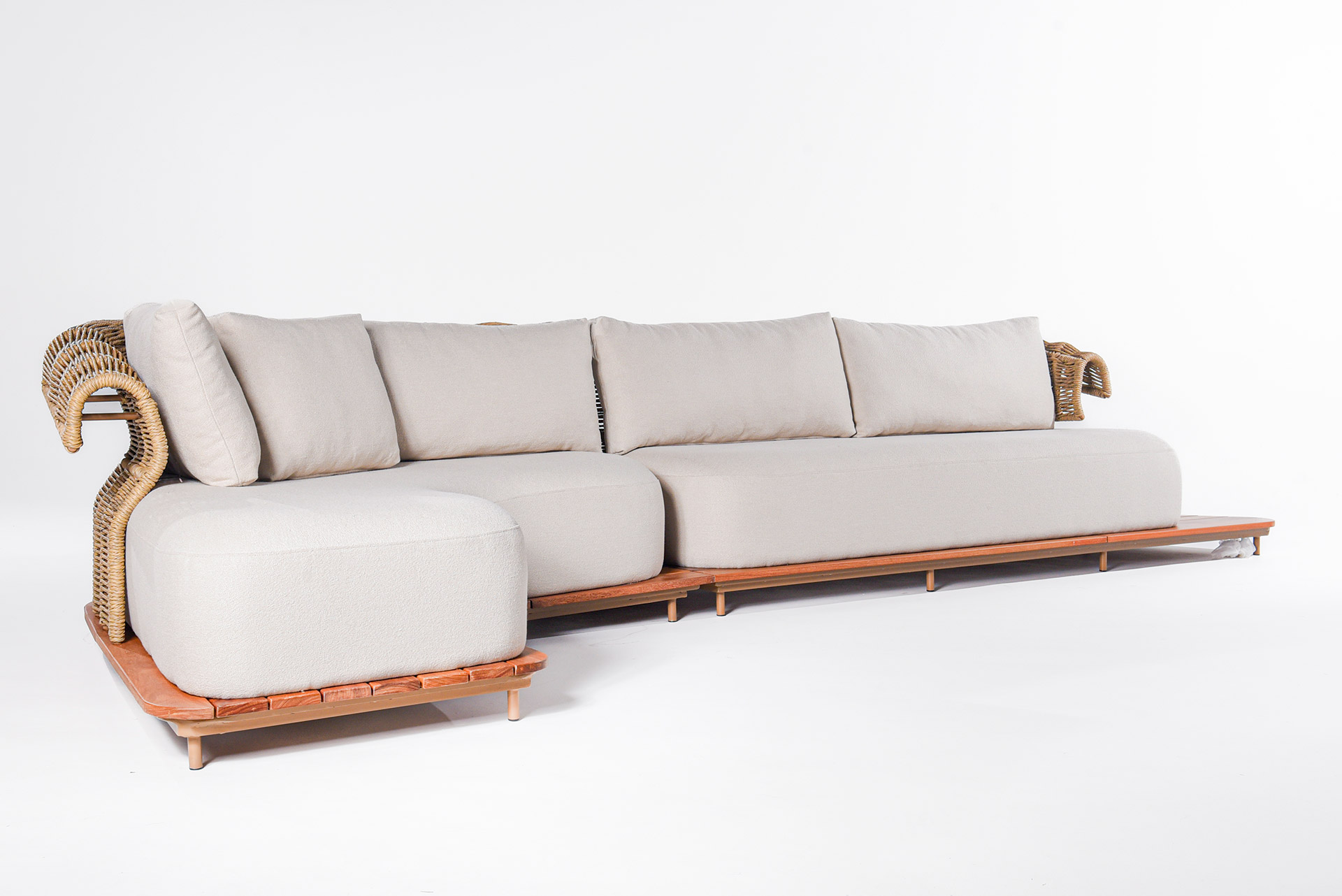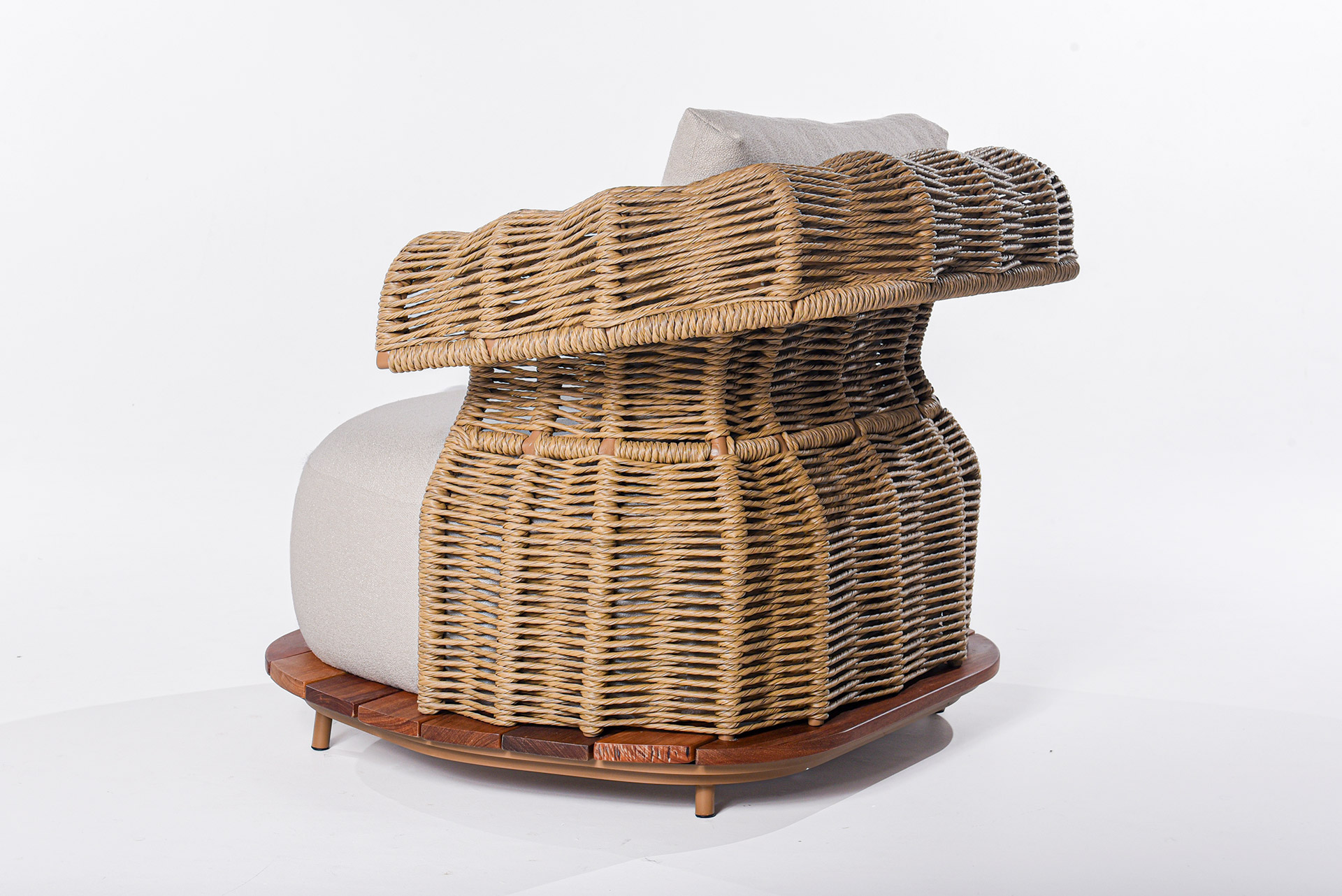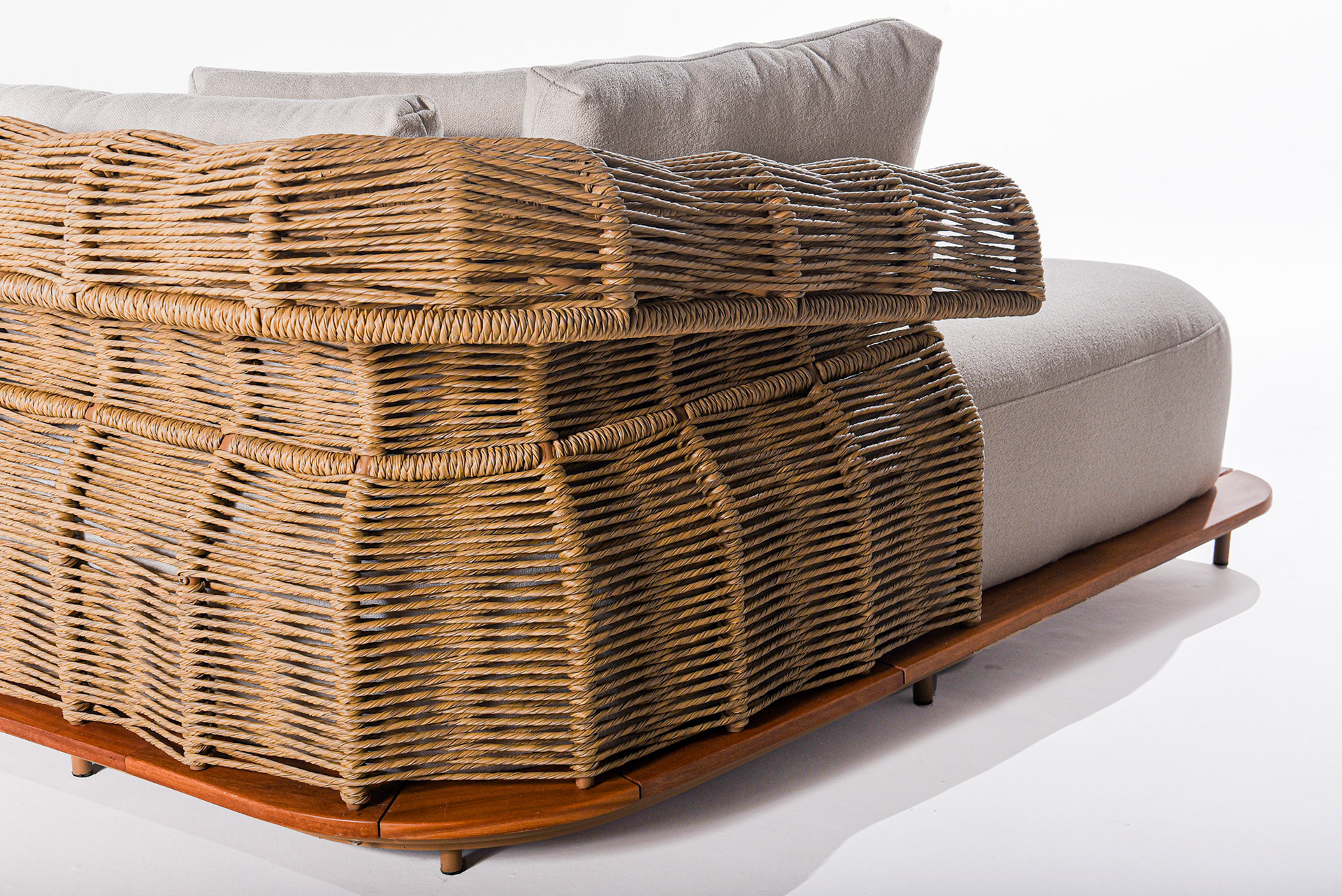 Com estrutura sólida e base em madeira natural, o sofá une conforto e resistência, tornando-se perfeito para áreas externas que valorizam bem-estar e design. Seu estofado generoso e macio convida ao relaxamento, enquanto o acabamento artesanal reforça o cuidado em cada detalhe.