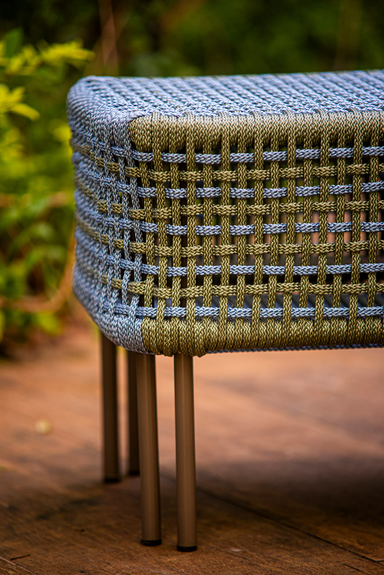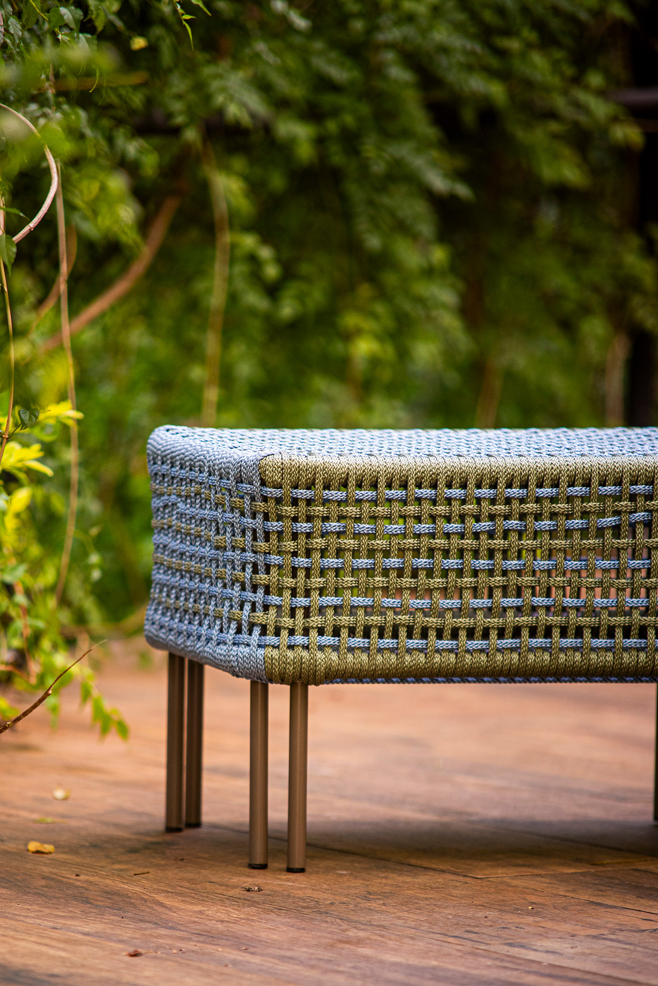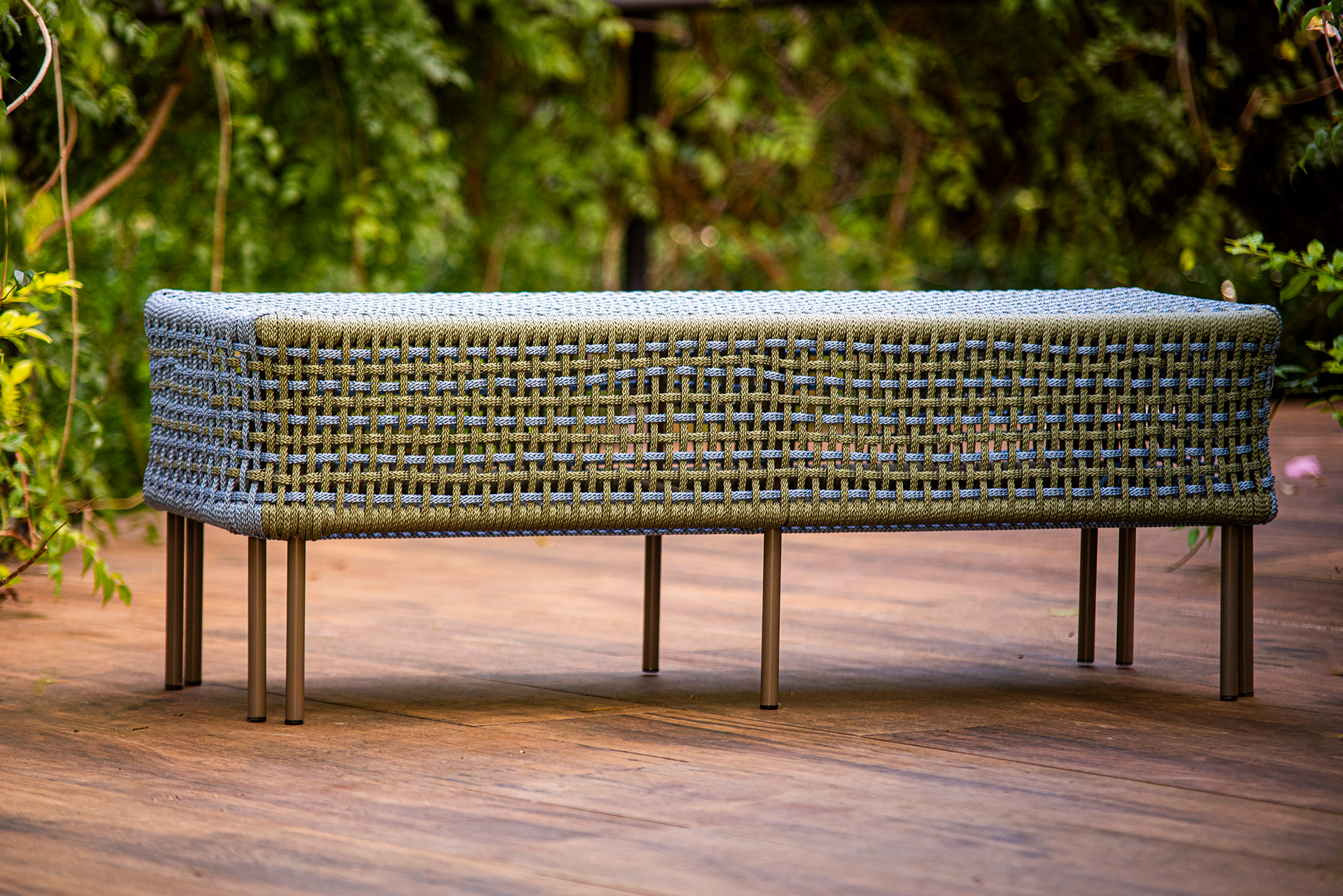 Estrutura em alumínio, pintura eletrostática e revestimento em corda náutica chata 10mm.