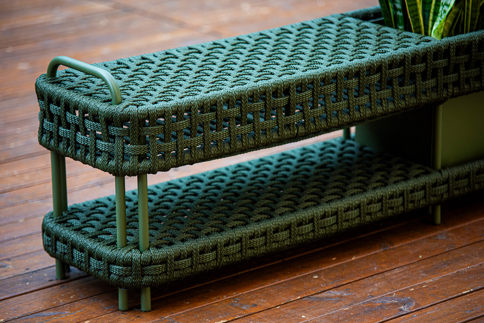 Estrutura em alumínio, pintura eletrostática e revestimento em corda náutica cilíndrica 6mm.