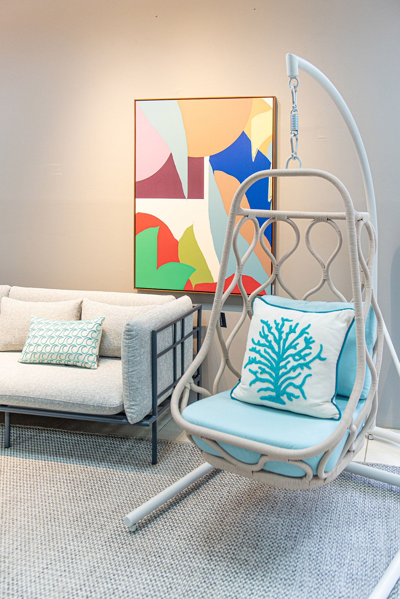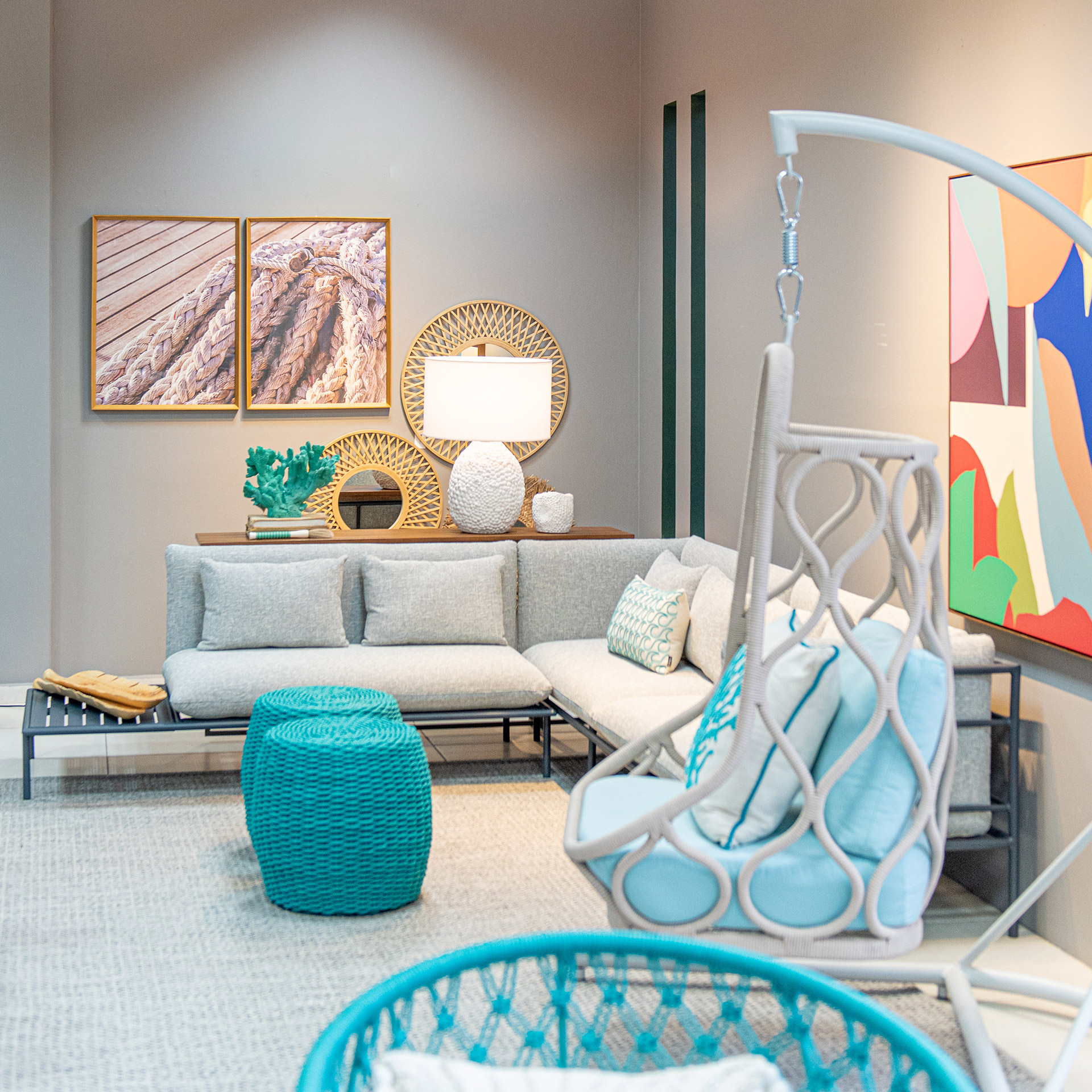 Estrutura em alumínio, pintura eletrostática e revestimento em corda náutica cilíndrica 6mm.