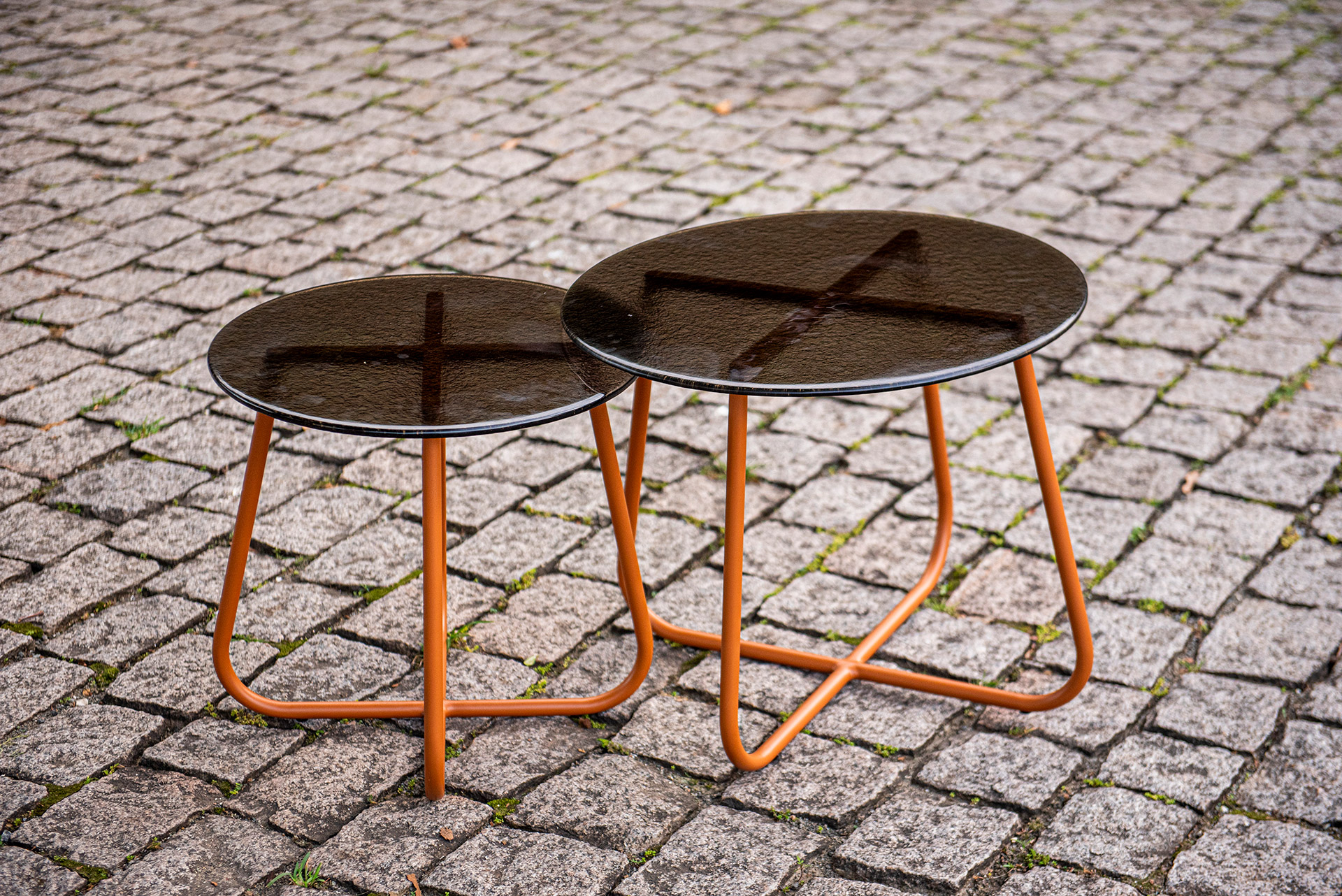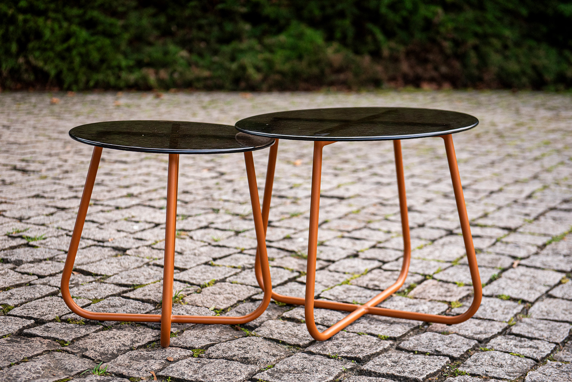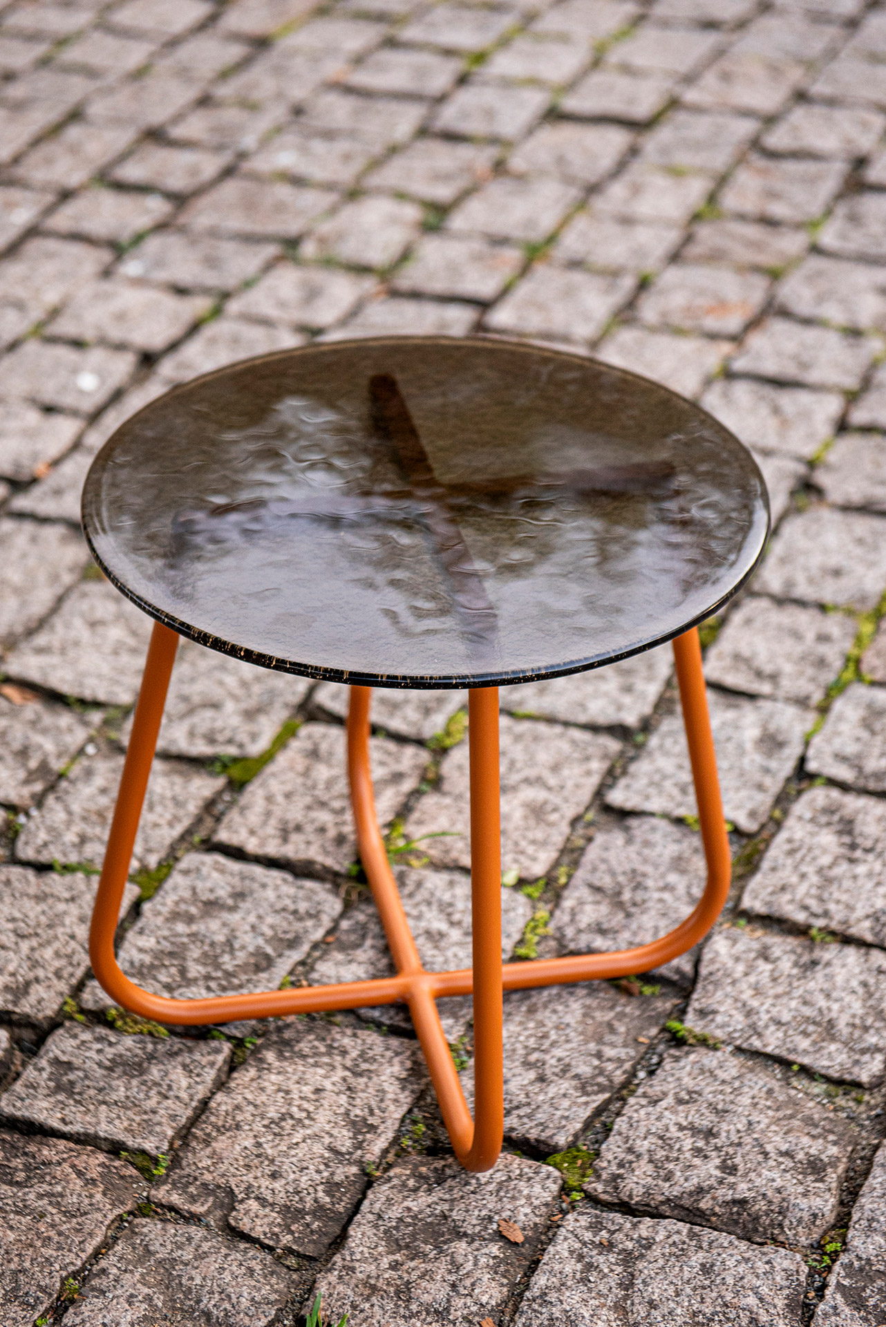 Mesa de apoio Banari: vidro texturizado para área externa.