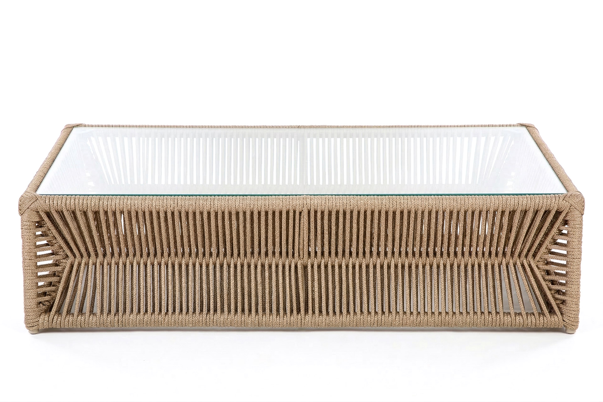 MATERIAL E ACABAMENTO: Estrutura em alumínio, pintura eletrostática e revestimento em corda náutica cilíndrica 10mm. MEDIDAS: Mesa de centro 1,40 x 0,80 x 0,35