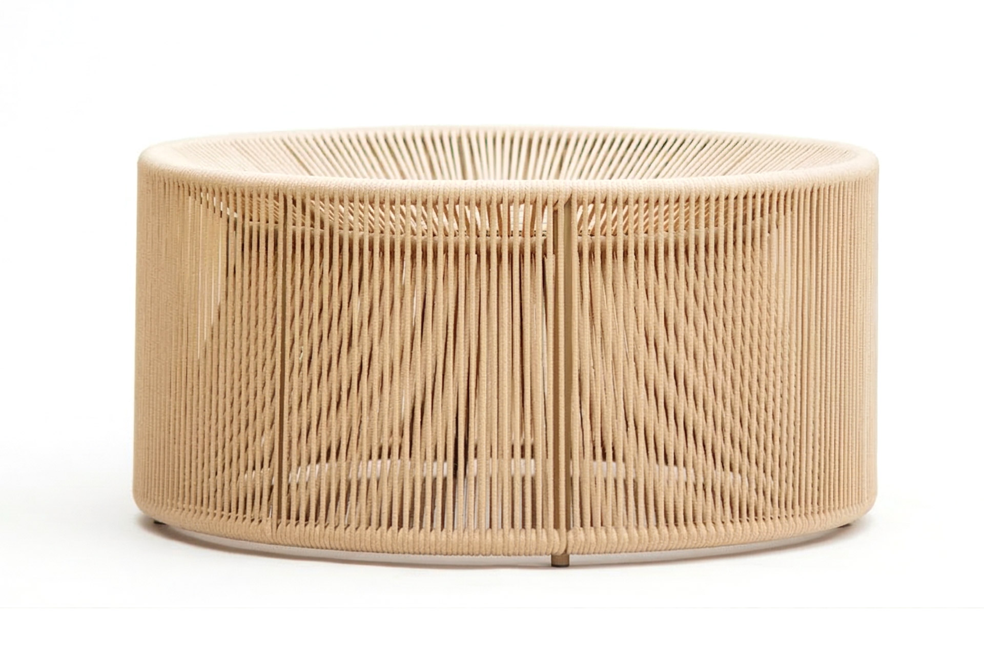 MATERIAL E ACABAMENTO: Estrutura em alumínio, pintura eletrostática e revestimento em corda náutica cilíndrica 10mm. MEDIDAS: Ø 1,00 x 0,35 m bloco 3d: Mesa