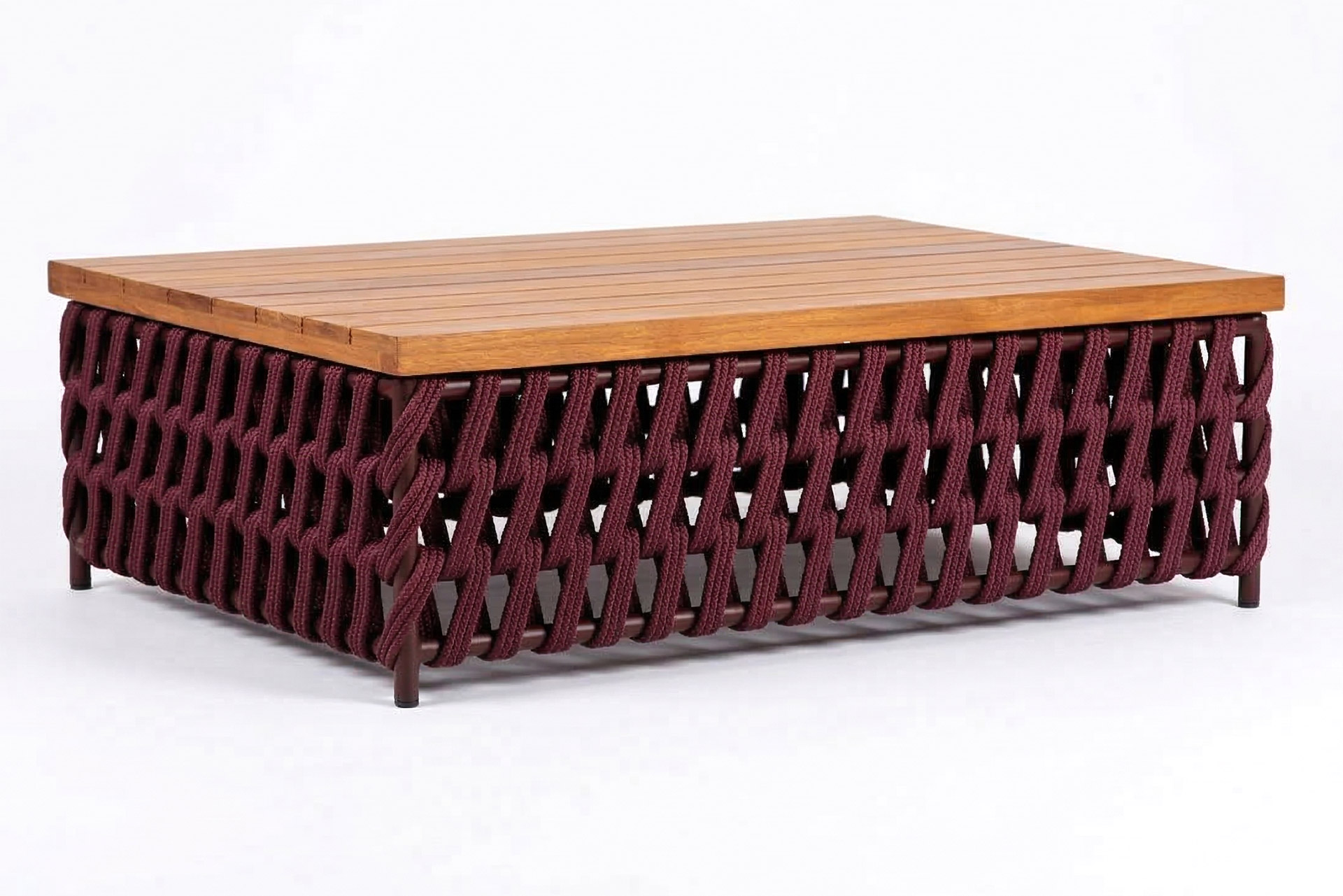 MATERIAL E ACABAMENTO: Estrutura em alumínio, pintura eletrostática e revestimento em corda náutica cilíndrica 10mm. MEDIDAS: 1,20 x 0,80 x 0,35 m Linha Zibello: