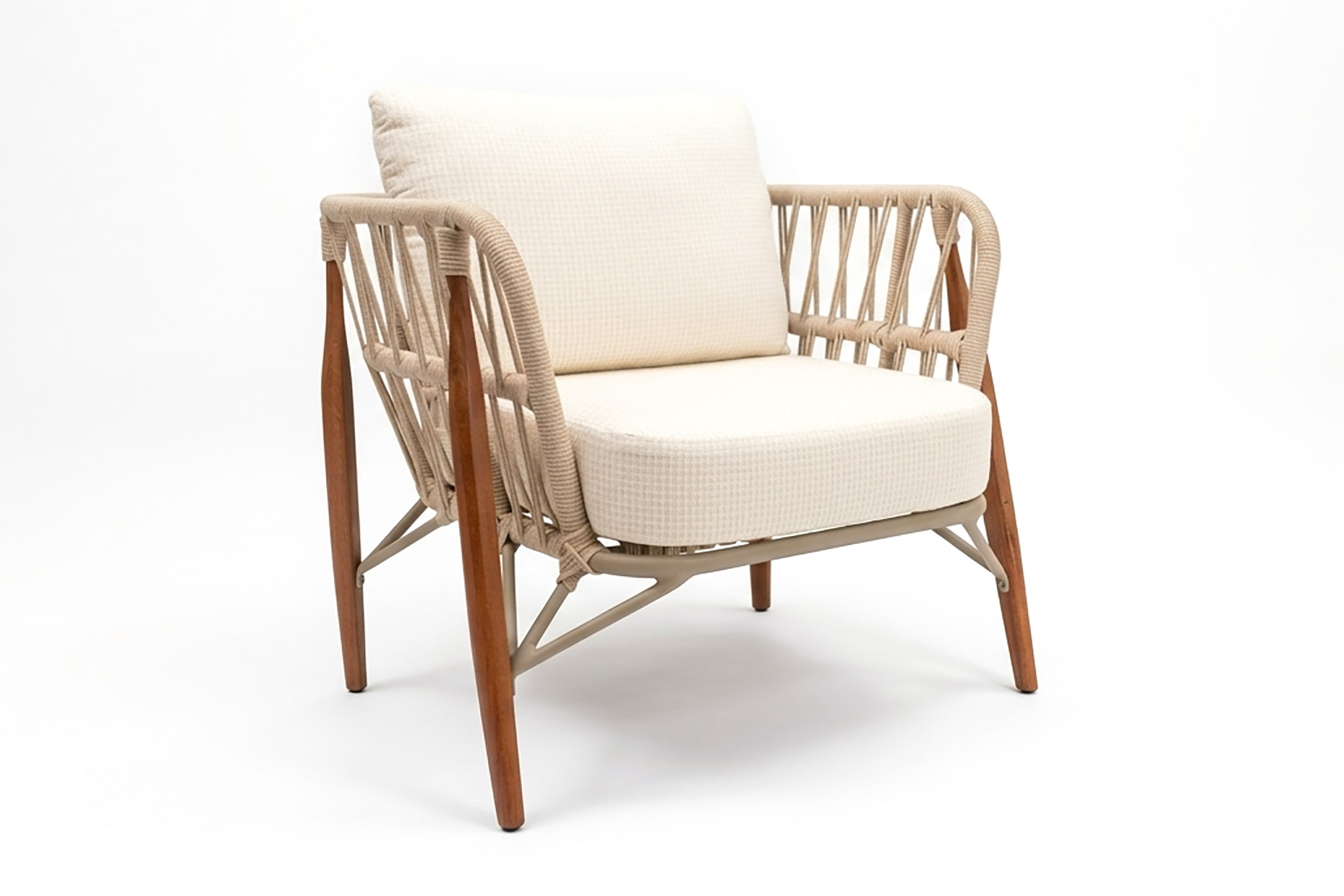 MATERIAL E ACABAMENTO: Estrutura em alumínio, pintura eletrostática, revestimento em corda náutica cilíndrica 6mm e pés em madeira. MEDIDAS: Poltrona 0,80 x 0,70 x