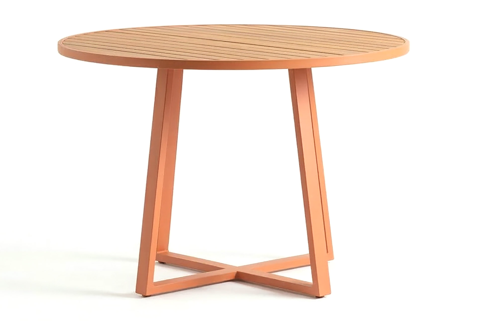 MATERIAL E ACABAMENTO: Estrutura em alumínio com pintura eletrostática, tampo em madeira ripada, alumínio liso ou alumínio ripado. MEDIDAS: 0,90 x 0,90 x 0,76