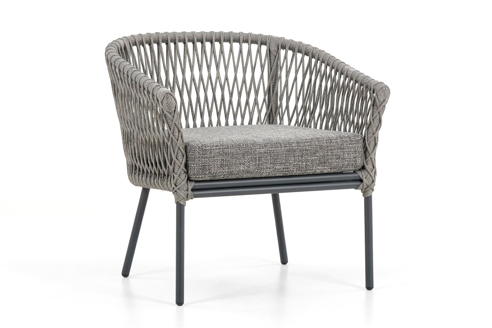MATERIAL E ACABAMENTO: Estrutura em alumínio, pintura eletrostática e revestimento em corda náutica cilíndrica 6mm MEDIDAS: Poltrona 0,78 x 0,78 x 0,63 m Sofá