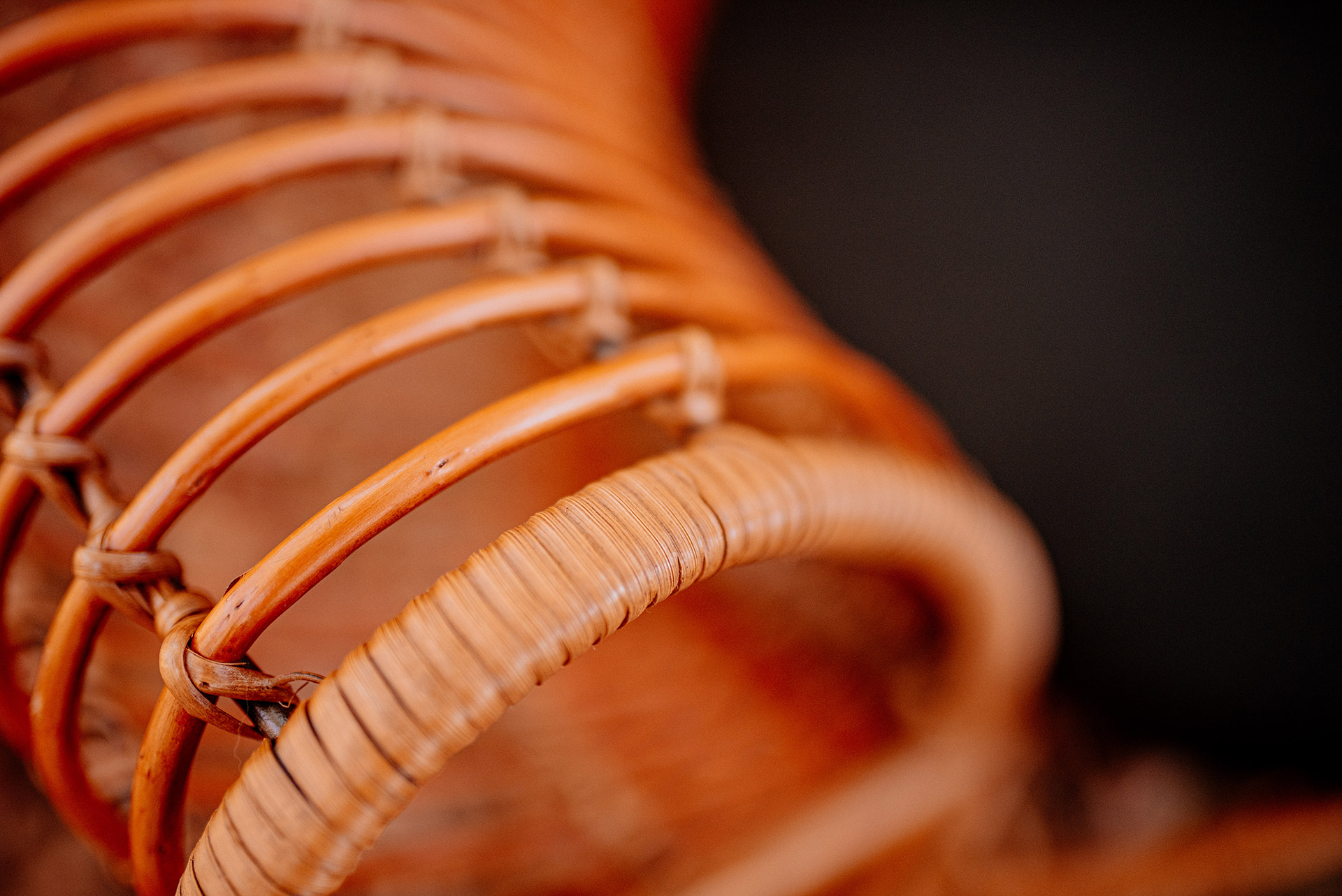 Estrutura em ferro galvanizado e revestimento em vime e amarras em junco.